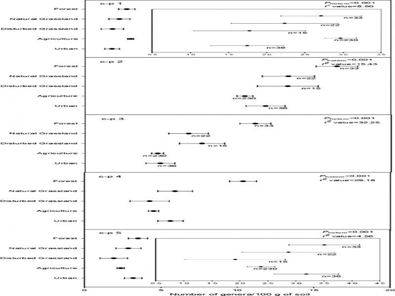 The abundance of c-p 1 guild per 100 g of soil was higher in agriculture ecosystems than in NGL ecosystems; abundance of c-p 2 guild per 100 g of soil was higher in DGL and agriculture ecosystems than in urban ecosystems and abundance of c-p 3 guild per 100 g of soil was higher in agriculture ecosystems than in NGL and urban ecosystems In contrast, the abundance of c-p 4 and c-p 5 guilds per 100 g of soil was higher in undisturbed ecosystems than disturbed ecosystems (P hetero < 0.05) (Fig. 9). Likewise, the abundance of c-p 1 per 100 cm3 soil was higher in agricultural ecosystems than in forest ecosystems. The abundance of c-p 2 and c-p 3 guilds per 100 cm3 soil was higher in DGL ecosystems than the other ecosystems, while the abundance of c-p 5 guild per 100 cm3 soil was higher in forest ecosystems, which are relatively undisturbed (P hetero < 0.05). Abundance of c-p 4 nematodes per 100 cm3 soil was not significantly different among ecosystems (P hetero > 0.05) (Fig. 10).