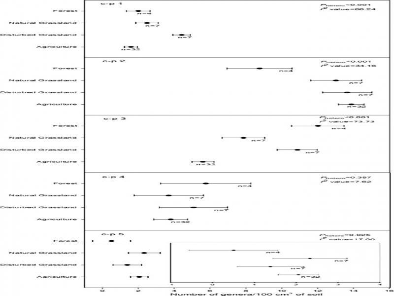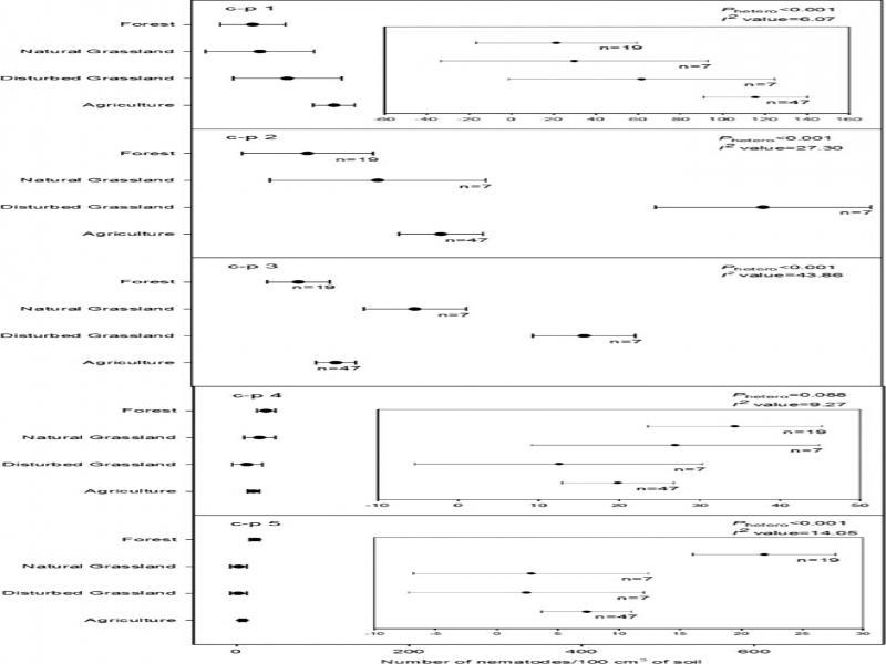 Effect of ecosystem on genus-level nematode richness of each c-p guild. Mean values are the weighted summary effect sizes and the bars represent standard error for comparing richness of nematodes at c-p guilds 1 to 5 per 100 g of soil in different ecosystems. Letter n is the number of studies reporting data at each ecosystem. P hetero < 0.05 is evidence that ecosystem levels differed. I 2 is the percentage of true or real variation among ecosystem levels. The inset in c-p 1 and c-p 5 forest plots is the enlarged view of the respective forest plots.