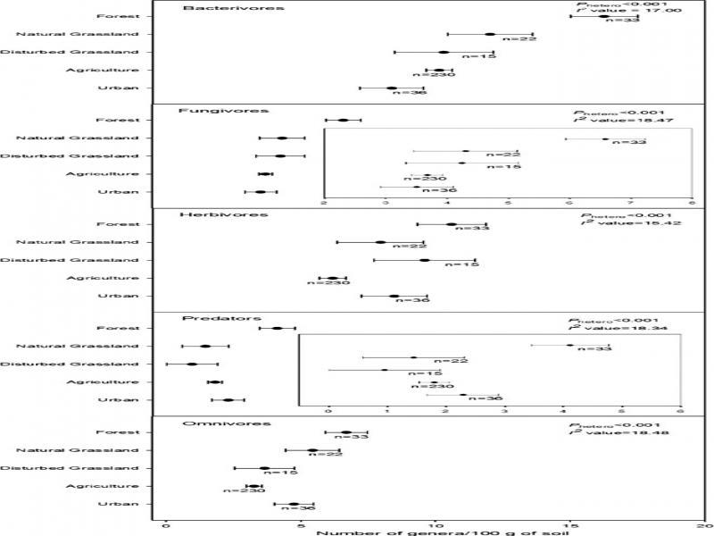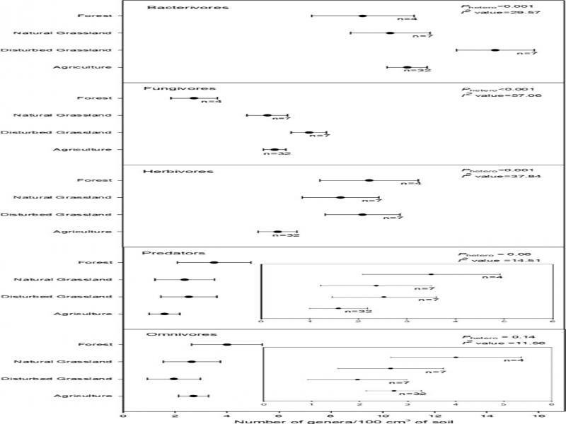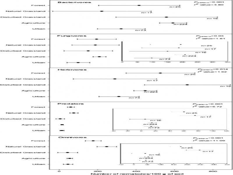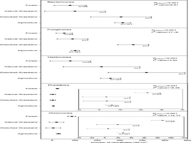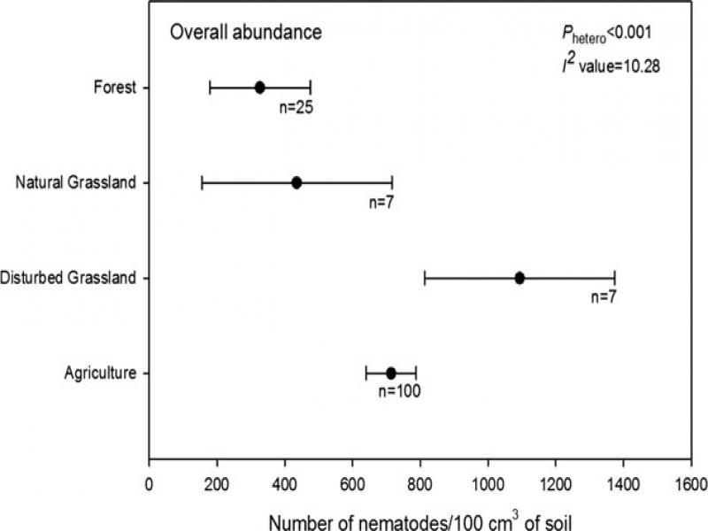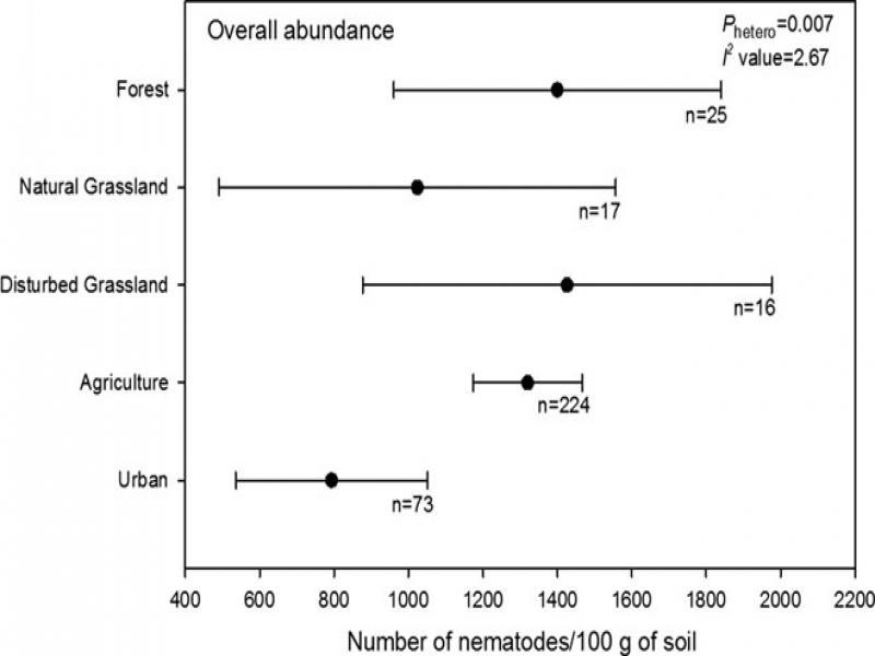 Comprehensive meta-analyses of distinct ecosystems with different schemes of human intervention from 111 publications, using random effects model and non-parametric variance, confirmed that nematode richness was higher in less disturbed ecosystems (forest and NGL) compared to more disturbed ecosystems (agriculture, DGL, and urban ecosystems), nematode abundance of trophic groups in the lower hierarchy of the soil food web was higher in more disturbed ecosystems and nematode abundance of trophic groups in the higher hierarchy of the soil food web was higher in less disturbed ecosystems, consistent with general findings from previous works in the field of nematode ecology.