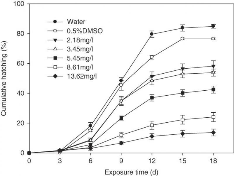 Cumulative hatching percentage of H. glycines free eggs exposure to fosthiazate with exposure time. The error bars in the picture referred to standard error.