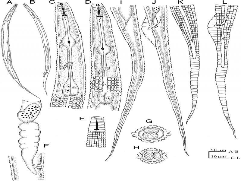Figure 1: Coslenchus paramaritus n. sp. (line drawing). (A, B) Entire body in female and male. (C, D) Anterior portion. (E) Anterior end in dorso-ventral view. (I, K) Female tail. (J, L) Male tail. (F) Reproductive system. (G, H) Cross section at mid-body.