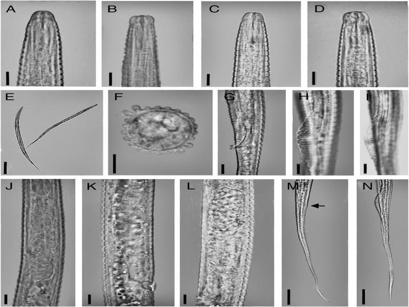 Figure 2: Coslenchus paramaritus n. sp. (light photograph). (A) Female Anterior end (Lateral view). (B) Female Anterior end (Dorso-ventral view). (C) Male anterior end (Lateral view). (D) Male anterior end (Dorso-ventral view). (E) Entire body. (F) Cross section at mid-body. (G–I) Spicules and Bursa. (J) End portion of esophagus. (K, L) Female reproductive system. (M) Female tail. (N) Male tail. (A–D, F–L = 5 µm, E = 100 µm, M–N = 20 µm).