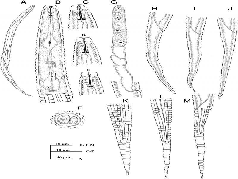 Figure 3: Coslenchus cancellatus (Cobb, 1925) Siddiqi, 1978 (line drawing). (A) Entire body in female. (B) Anterior portion. (C, D) Anterior end in lateral view. (E) Anterior end in dorso-ventral view. (F) Cross section at mid-body. (G) Reproductive system. (H–M) Female tail.