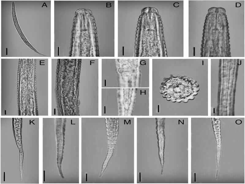 Figure 4: Coslenchus cancellatus (Cobb, 1925) Siddiqi, 1978, female (light photograph). (A) Entire body. (B, C) Anterior end in lateral view. (D) Anterior end in dorso-ventral view. (E) Posterior of esophagus. (F) Reproductive system. (G) Front view of vulva. (H) Front view of anus. (J) Lateral field. (K) tail. (L–O) Posterior of tail. (A = 20 µm, B–G, L–O = 5 µm, K = 50 µm.)
