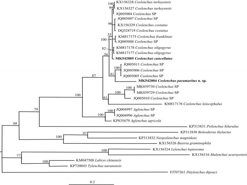 In our phylogeny tree, the new species formed a sister clade with three unknown populations of Coslenchus (JQ005005, JQ005006, and JQ005011). The other species, C. cancellatus formed a sister clade with other Coslenchus species including C. oligogyrus, C. franklinae, C. costatus, C. turkeyensis and three unknown populations. Our current knowledge of the taxonomy of the genus Coslenchus mostly comes from classic morphological and morphometric data. Current molecular data in GenBank are only available for a few species; however, some of them are not linked to published descriptions and therefore the morphological characters of those isolates are unknown. The inclusion of new or existing representatives of Coslenchus provides an opportunity to obtain a better insight into the intra- and inter-generic structure of the genus within other members of the family Tylenchidae.