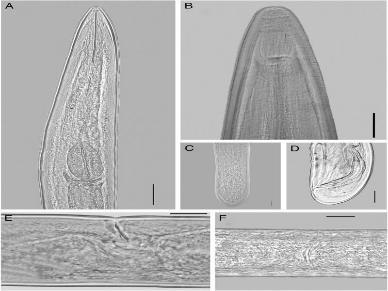 Figure 1: Longidorus mindanaoensis (Coomans et al., 2012) from Vietnam. (A–F) Female. (A) Esophageal region; (B) Anterior region; (C) Posterior region; (E) Vulval region; (F) Vulva region, ventral view. (D) Male posterior region. (Scale: (A) 50 µm; (B–F) 20 µm).