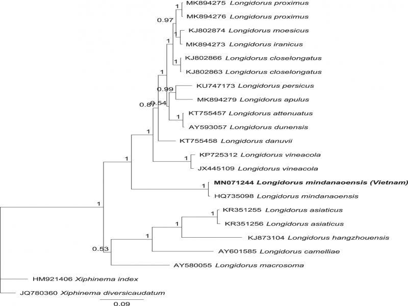 Figure 2: Bayesian phylogenetic tree generated using D2–D3 expansion segments of Longidorus mindanaoensis (Coomans et al., 2012) from Vietnam using Xiphinema index (Thorne and Allen, 1950) and Xiphinema diversicaudatum (Micoletzky, 1927) (Thorne, 1939) as outgroup taxa under the GTR+G evolutionary model.