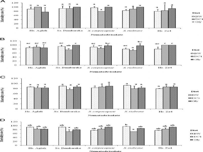 Mortality rate (mean ± standard deviation) of G. mellonella larvae based on diet, nematode isolate, and exposure time (T1-T4): (A) T1 (1 wk); (B) T2 (2 wks); (C) T3 (3 wks); and (D) T4 (4 wks). Mortality rates followed by the same letter do not significantly differ at P < 0.05. BW, beeswax; Gly, standard glycerol-based artificial diet; DC1, adult dog croquettes.