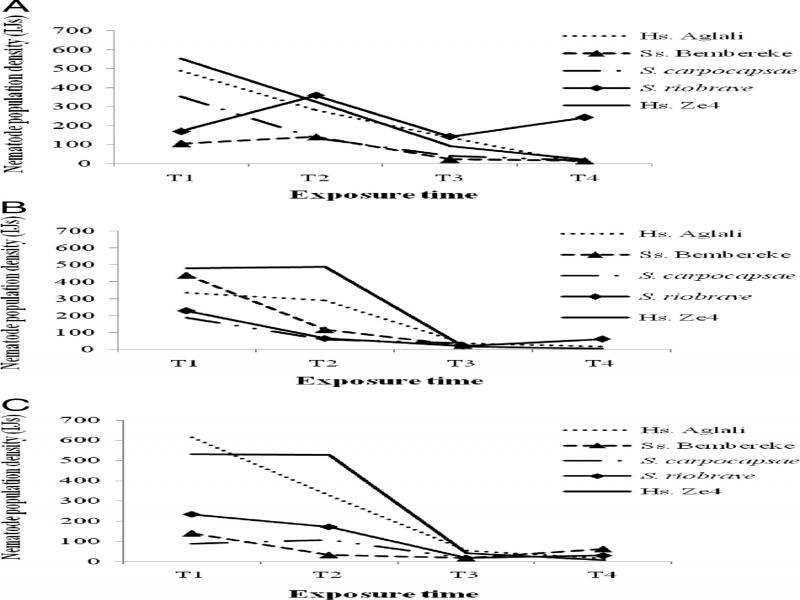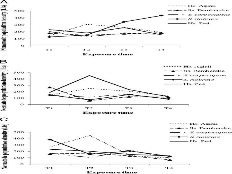 Nematode population density based on nematode isolate and exposure time (T1-T4), over 7 d after the first appearance of nematodes in White traps for the BW (beeswax), DC1 (adult dog croquettes), and Gly (standard glycerol-based artificial diet) diets. The nematode population densities presented are the means obtained in 50 μ l of suspension/larvae: (A) BW; (B) DC1; and (C) Gly.