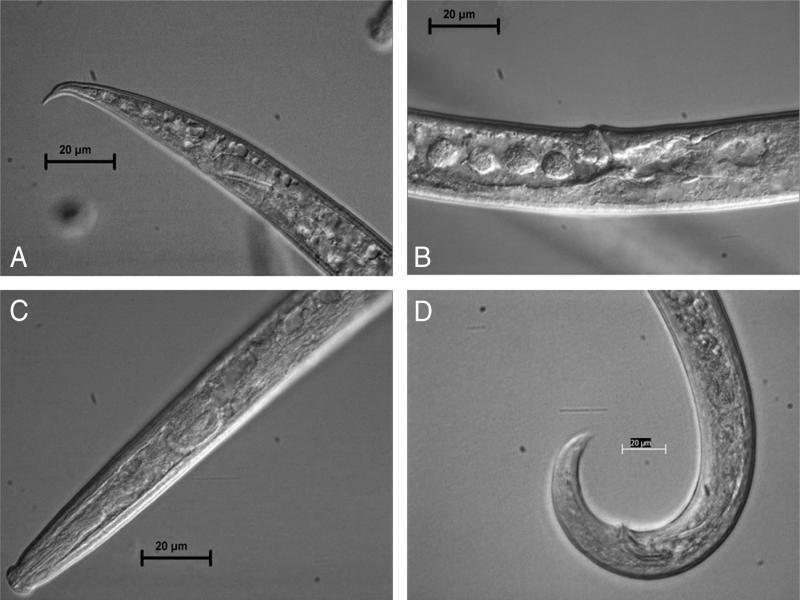 Aphelenchoides stammeri (A: female tail, B: female vulva, C: female anterior region and D: male tail. Scale bar = 20 µm).