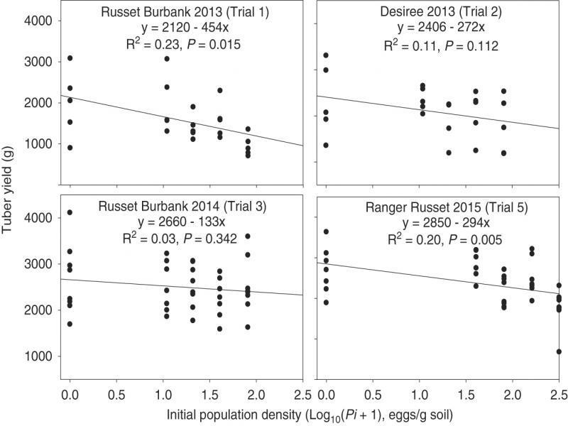 Impact of initial egg density (Pi) of Globodera ellingtonae on yield of potato (Solanum tuberosum) cv. Russet Burbank grown in microplots. A linear model of the relationship between G. ellingtonae log10 (P i + 1) and tuber yield was determined.