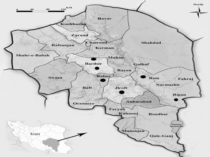 A map of the Kerman Province of Iran showing the five counties (indicated with black circles) where nematode samples were collected during four consecutive seasons during the 2013 seasons.