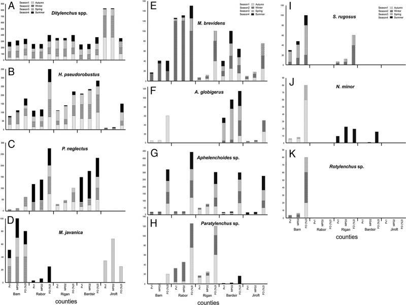 (A-K) Prominence, mean population densities and occurrence of 11 plant-parasitic nematode species identified from the bulk soil of alfalfa plants in five counties during four consecutive seasons (Autumn; Winter; Spring; Summer) in the Kerman Province of Iran.
