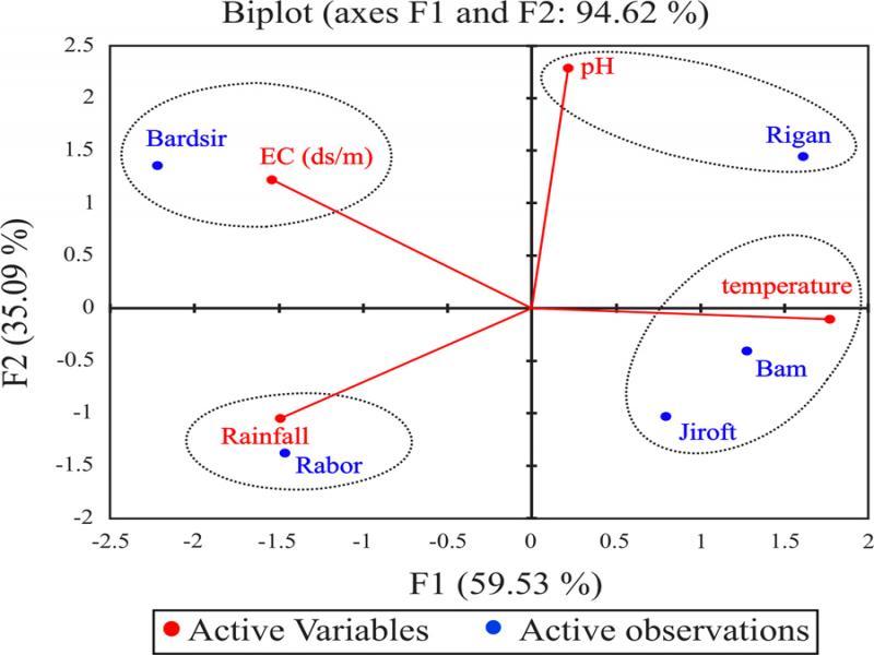 Correlation of the temperature, rainfall, pH and EC on the diversity of plant-parasitic nematodes for the counties (Bam, Rabor, Rigan, Bardsir and Jiroft) using principal component analysis (PCA).