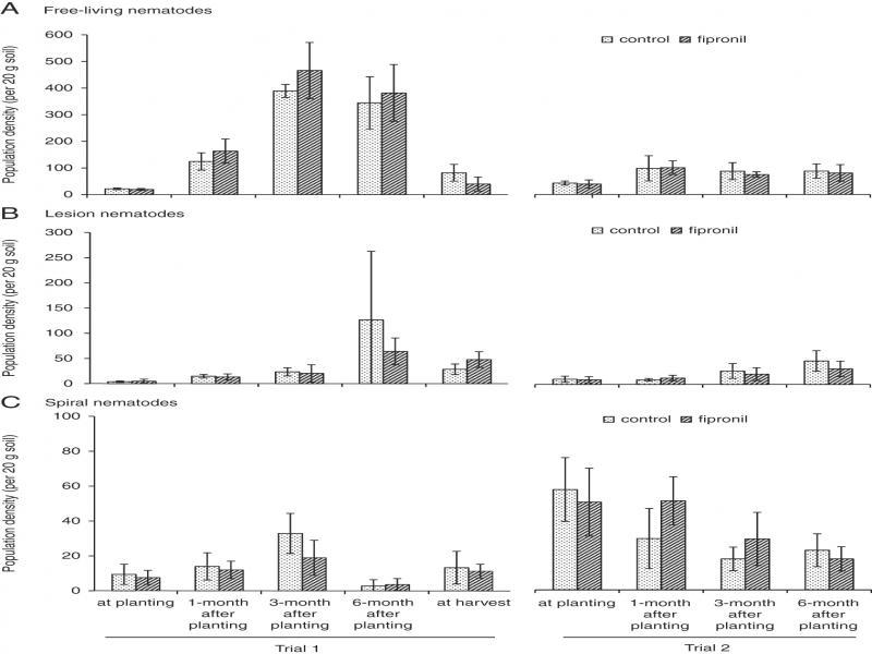 Nematode population densities in soil in Trials 1 and 2 of the field experiment. (A) Free-living nematodes; (B) root-lesion nematodes (Pratylenchus zeae and P. coffeae), and (C) spiral nematodes (Helicotylenchus sp.). Each bar is the mean of four replicates±standard deviation.