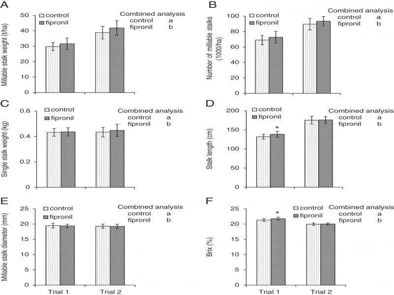 Effect of fipronil treatment on sugarcane yield in Trials 1 and 2 of the field experiment. (A) Millable stalk weight; (B) Number of millable stalks; (C) Single stalk weight; (D) Stalk length; (E) Millable stalk diameter; and (F) Brix. Each bar is the mean of 16 replicates ± standard deviation (*P < 0.05). Different letters indicate significant difference (P < 0.05) between the treatments when the trials were analyzed together in ANOVA. There was no interaction between treatment and trial.