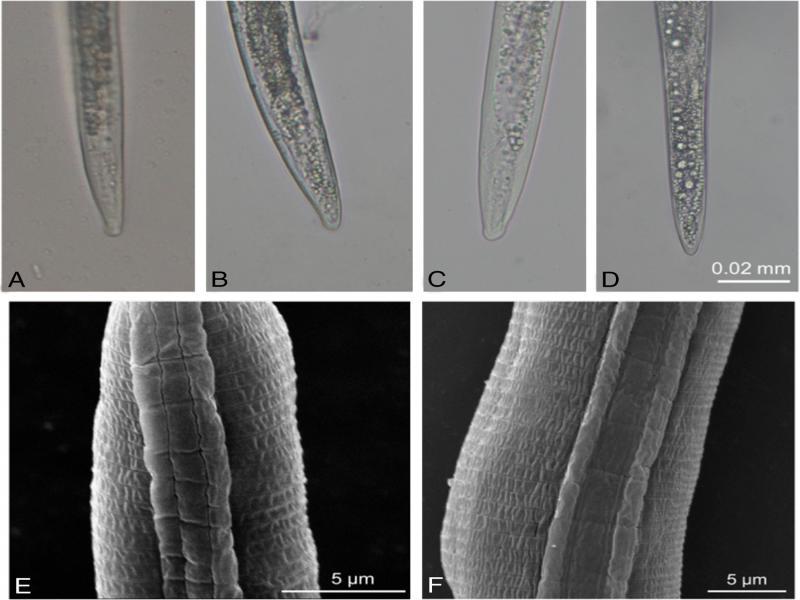The morphological variations within the P. vulnus Taiwan strawberry population. Two lateral field types and four tail termini were observed. Photographs were taken at 1000X magnification with compound microscope and SEM.