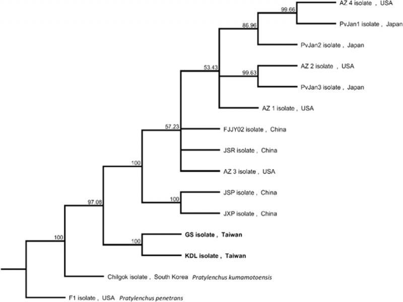 Molecular analysis of the ribosomal RNA and mitochondrial gene sequences of the extracted nematodes confirmed their species as P. vulnus (Table 1). The rDNA LSU region (D2A/D3B: ACAAGTACCGTGAGGGAAAGTTG/TCGGAAGGAACCAGCTACTA) (Nunn, 1992), rDNA ITS region (TW81/AB28: GTTTCCGTAGGTGAACCTGC/ATATGCTTAAGTTCAGCGGGT) (Amiri et al., 2002; Subbotin et al., 2001), rDNA SSU region (SSU18A/SSU26R: AAAGATTAAGCCATGCATG/CATTCTTGGCAAATGCTTTCG) (Eyualem and Blaxter, 2003) and mtDNA COI region (JB3/JB4.5: TTTTTTGGGCATCCTGAGGTTTAT/TAAAGAAAGAACATAATGAAAATG) (Derycke et al., 2010) of the Pv-GS and Pv-KDL are 99.04, 95.96, 99.66 and 99.24% identical, respectively. Both Pv-GS and Pv-KDL isolates had maximum 100% similarity of their rDNA LSU sequences to P. vulnus (GenBank accession: U47547.1). The Pv-KDL mtDNA COI region sequences of isolates were 99.74 to 100% similar to other sequences of P. vulnus available in the database (GenBank accessions KY424094, KY424095, KY828312, KY828317, KY424096-7 and KX349427), and only 81.08% identical to the second most closely related species, P. scribneri (GenBank accession: KY424089.1). The rDNA SSU region sequence analysis provided a similar result as Pv-KDL and are 99.42% (GenBank accession: KY424163) to 99.88% (GenBank accession: KY424164) identical to all available P. vulnus sequences in GenBank, and only 94.48% similar to P. kumamotoensis (GenBank accession: AB905295.1). The rDNA ITS sequences also separated the Pv-KDL from P. kumamotoensis (GenBank accession: KT175521.1) clearly with a very low 86.22% similarity. Phylogenetic analysis of the rDNA ITS and LSU regions combined suggested the nematodes from the two fields belong to one population (Fig. 2) and are isolated from the rest of the previous populations from other geographic regions (Table 2).