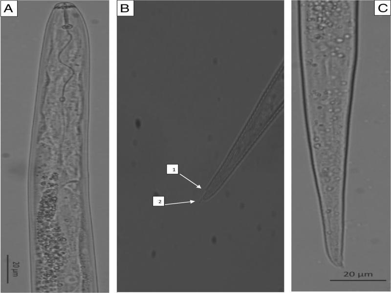 Hirschmanniella dicksoni n. sp. female: (A) Anterior region; (B) tail region (arrow 1: subterminal notch, arrow 2: ventral projection); (C) tail region. Scale bars in A, B, C = 20 µm.