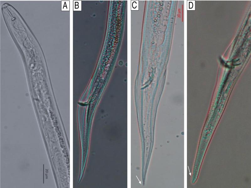 Hirschmanniella dicksoni n. sp. male: (A) Anterior region; (B, C, D) tail region (arrows: pointed and round tail terminus). Scale bars in A, B, C, D = 20 µm.