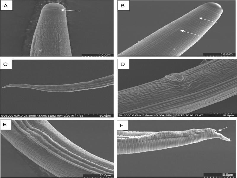 SEM photomicrographs of Hirschmanniella dicksoni n. sp. female: (A) Lip region (arrow: incomplete lip annules); (B) lateral field in anterior region (arrows: incomplete annules; rings and incisures on the beginning on lateral field); (C) posterior region; (D) vulva and lateral fields; (E) lateral field in middle body region showing incomplete aerolations; (F) tail region with subterminal notch (arrow: subterminal notch).