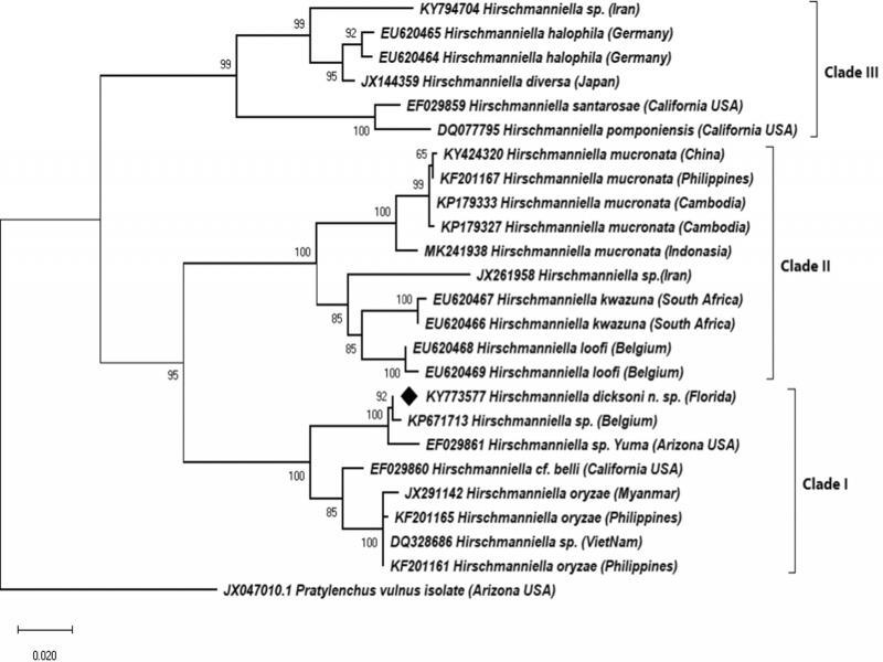 Although D2–D3 expansion segments of 28S rRNA from H. dicksoni n. sp. species showed 99% similarity over 100% query cover with two isolates identified as H. mucronata from Jiangsu, China (KR780066 and KR780067), these sequences showed closer similarity with H. oryzae than other isolates of H. mucronata from the Philippines (KF201167) and Cambodia (KP179327 and KP179333). Therefore, we did not include these sequences in the phylogenetic analysis because we did not consider these sequences as H. mucronata. The phylogenetic analysis excluding these sequences from China isolates indicates that the sequences from H. dicksoni n. sp. and other species of Hirschmanniella obtained from GenBank were grouped into three different clades (Fig. 4). The D2–D3 expansion segments of 28S rRNA from H. dicksoni n. sp. clustered together with the undescribed species of Hirschmanniella from Yuma (Arizona) and Vietnam, H. belli from California, and H. oryzae in Clade I. The second clade included H. loofi, H. kwazuna, and H. mucronanta from the Philippines and Cambodia. The isolates of H. halophila, H. diversa, H. santarosae, and H. pomponiensis were grouped in Clade III.