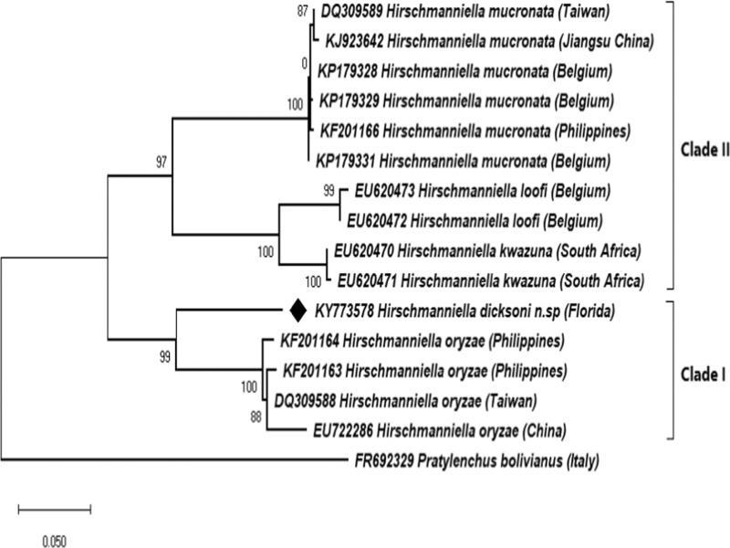The amplification of ITS1-5.8S-ITS2 r DNA yielded a single fragment of approximately 787 bp based on sequencing. Sequences from other species of Hirschmanniella obtained from NCBI were used for further phylogenetic studies (Table 2). The similarity search using BLAST tool showed that the ITS sequence from H. dicksoni n. sp. was 88% similar to H. oryzae (Vietnam isolate) over 99% query cover. As in the case of D2–D3 sequence analysis, the BLAST search using ITS sequence from H. dicksoni n. sp. also showed 96% similarity with sequences from an isolate of H. mucronata (KR780069) from Jiangsu, China, over 100% query cover. However, KR780069 showed higher similarity with H. oryzae sequence (88%) than with other isolates of H. mucronata sequences (84%) over 100% query cover. In contrast to this, another sequence (KJ923642) identified as H. mucronata from the same study (Jiangsu, China) showed only 85% similarity with H. dicksoni n. sp. over 74% query cover. The sequence KJ923642 showed 99% similarity with sequences from other isolates of H. mucronata, whereas the sequence KR78069 showed only 84% with H. mucronata over 100% query cover. Thus, since the identity of the China isolate KR78069 as H. mucronata was not certain based on the sequence analysis, we did not include this sequence in the phylogenetic analysis. The phylogenetic analysis excluding KR78069 showed that the sequences from H. dicksoni n. sp. and other isolates from GenBank were grouped into two clades. Hirschmanniella dicksoni n. sp. was grouped, as a sister species, with isolates of H. oryzae in Clade I, which was similar to the phylogenetic analysis based on D2–D3 sequence. The second clade included H. loofi, H. kwazuna and H. mucronata from the Philippines, Belgium, Taiwan, and China.