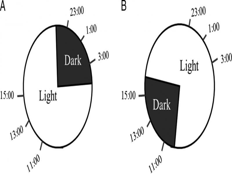 Sampling timepoints for normal (A) and inverted (B) light/dark cycles. To exclude the direct effect of light as a contributing factor to diurnal changes in penetration, we inverted light/dark cycles for equal period of light and dark as in normal condition. Inoculation was done at 2 hr interval for three time points at dark and three time points at light under both conditions. Root samples were collected at 24 hr post-inoculation at respective time points.