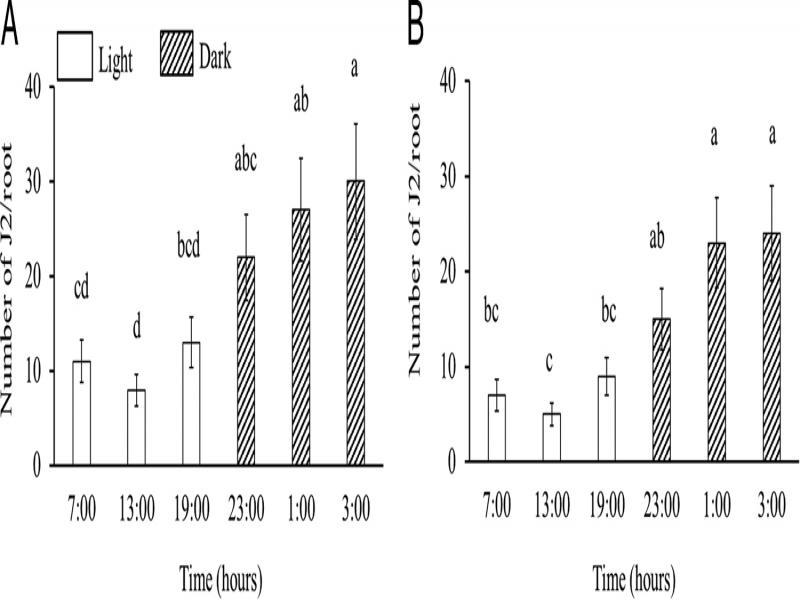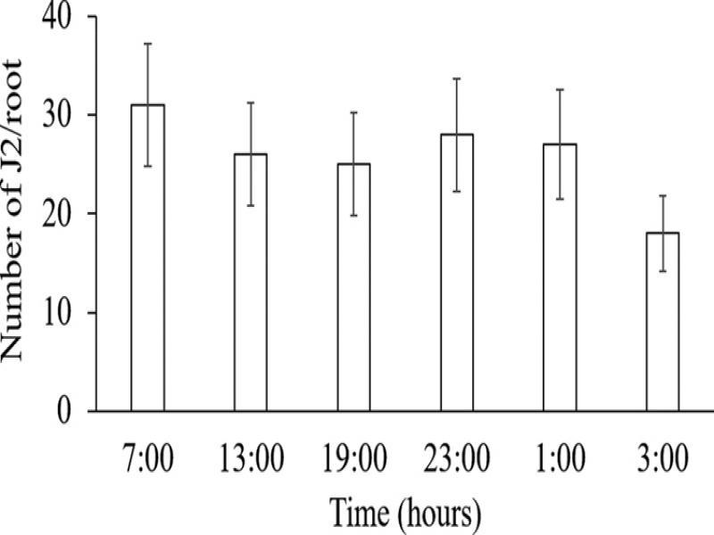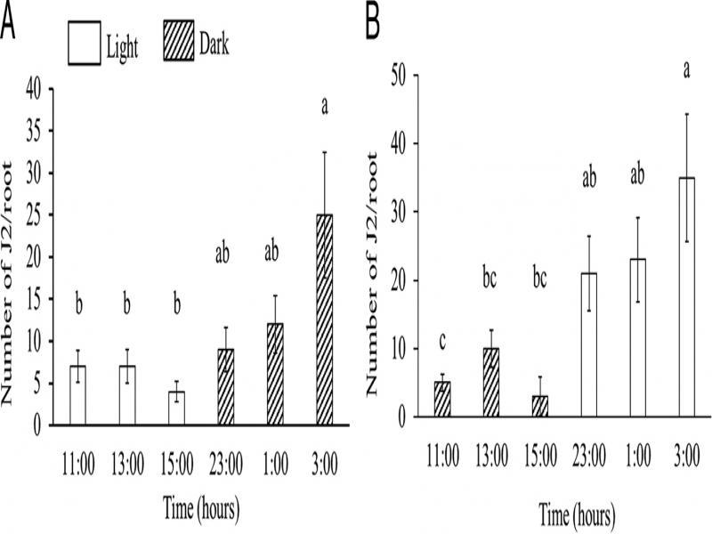 Host plants, Medicago truncatula were inoculated with RKN at six different time points; three times points during the light period and three time points in the dark period. In total, 24 hr post-inoculation, root samples were collected at respective time points to check the temporal variation in penetration. All infective juveniles were exposed to host roots for a 24 hr period before quantification.