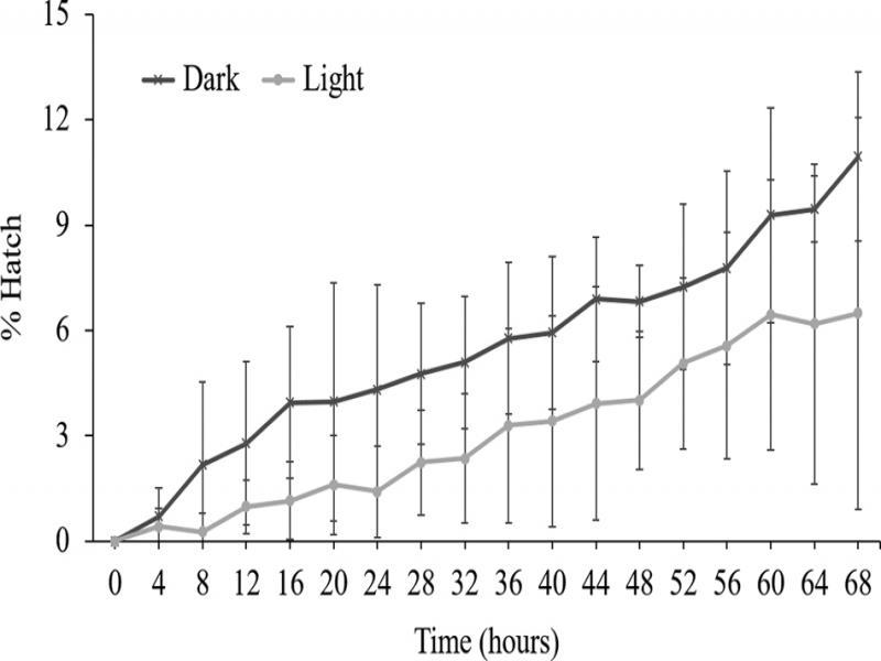 Percent egg hatch is not influenced by light and do not show temporal differences at different time points. Freshly harvested RKN eggs were observed for hatching over a period of 68 hr. Hatched juveniles were counted, and percent hatch was calculated. To examine influence of light we compared percent egg hatch between constant light and constant dark timepoints and to assess any temporal differences, percent egg hatch between consecutive time points under constant dark and constant light were measured. Bars represent standard error and means (n =12) are not significantly different (p > 0.05) according to paired t-test.