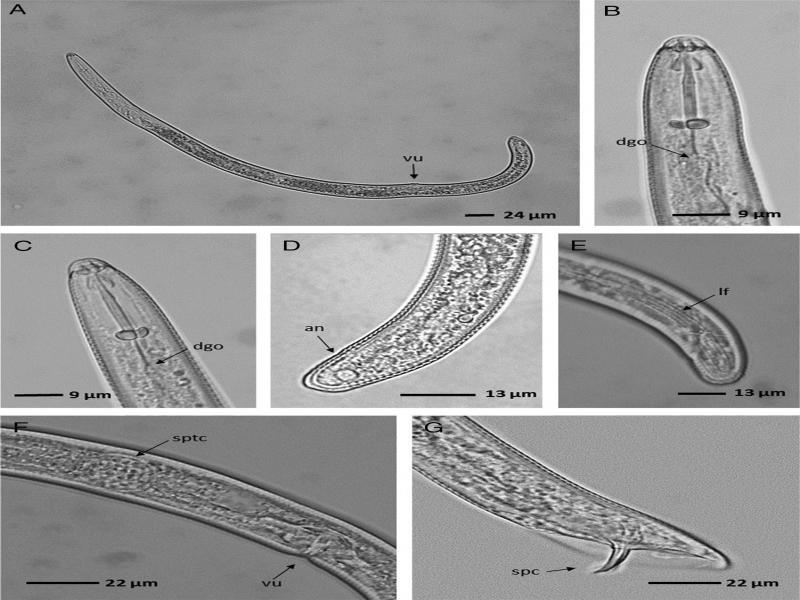 Helicotylenchus multicinctus. A: Habitus post-mortem of a female, B and C: Anterior region of female body, D and E: Posterior region of female body, F: Medium region of female body, G: Posterior region of male body. vu = Vulva, dgo = Dorsal esophageal Gland Orifice, an = Anus, lf = Lateral field, sptc = Spermatheca, spc = Spicule.