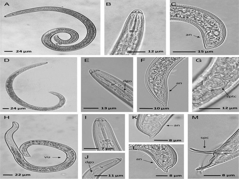 Helicotylenchus dihystera, H. erythrinae, and H. californicus. A: Habitus post mortis of a female in H. dihystera, B: Anterior region of female body in H. dihystera, C: Posterior region of female body in H. dihystera, D: Habitus post mortis of a female in H. erythrinae, E: Anterior region of female body in H. erythrinae, F: Posterior region of female body in H. erythrinae, G: Spermatheca of female in H. erythrinae, H: Habitus post mortis of female in H. californicus, I and J: Anterior region of female body in H. californicus, K: Posterior region of female body in H. californicus with short ventral projection and sharply pointed tail, L: Posterior region of female body in H. californicus with short ventral projection and blunt tail, M: Posterior region of male body in H. californicus.