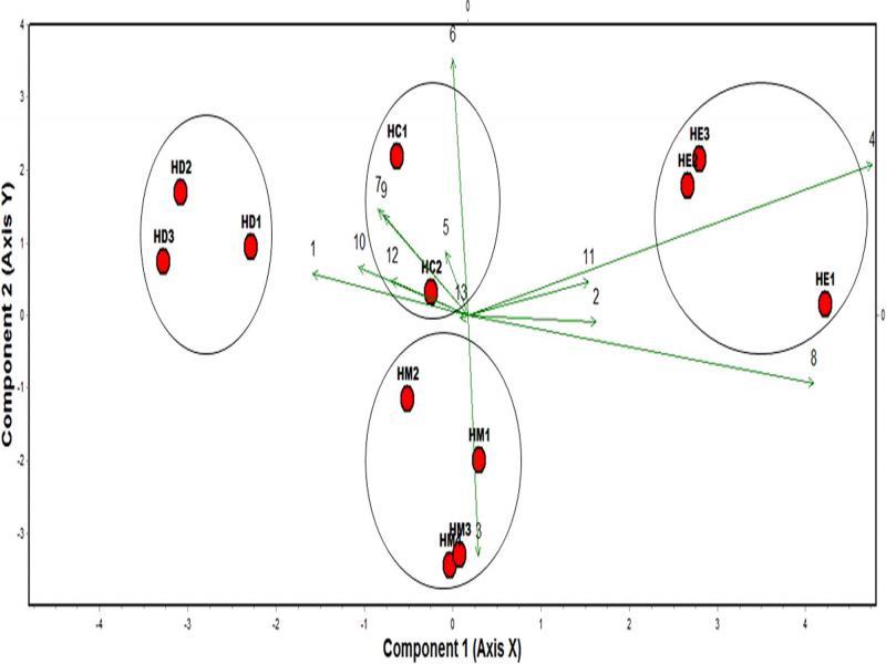 Populations of H. multicinctus (HM), H. dihystera (HD), H. erythrinae (HE), and H. californicus (HC) from Colombia and Brazil can be assigned to its corresponding species based on morphometric data. The two first axes of a principal components analysis (PCA) are shown. HM1 to HM2 from Colombia and HM3 to HM4 from Brazil; HD1 to HD3 from Colombia; HE1 to HE3 from Colombia; and HC1 from Colombia and HC2 from Brazil.