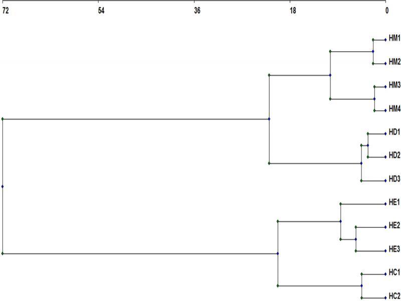 Dendrogram obtained by a conglomerates analysis to classify the Colombian and Brazilian populations of H. multicinctus (HM), H. dihystera (HD), H. erythrinae (HE), and H. californicus (HC). HM1 to HM2 from Colombia and HM3 to HM4 from Brazil; HD1 to HD3 from Colombia; HE1 to HE3 from Colombia; and HC1 from Colombia and HC2 from Brazil.