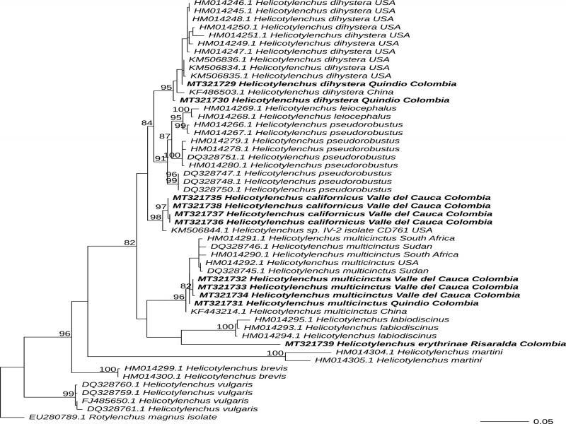 Maximum likelihood phylogeny of Helicotylenchus. The tree was estimated using the D2 to D3 expansion segment of 28S RNAr and 250 bootstraps under GTR + Γ model. The outgroup (Rotylenchus magnus) is shown in gray font; the sequences that were obtained in this study appear in bold typeface. Values at the nodes represent the bootstrap support. Were provided bootstrap support for nodes with values > 80. The scale represents the number of substitutions per site.