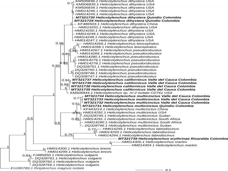 Bayesian phylogeny of Helicotylenchus based on D2 to D3 expansion segment of 28S RNAr. The phylogeny is a consensus tree from a posterior distribution of 1,600 trees that were inferred under GTR + Γ model in MrBayes. The outgroup (Rotylenchus magnus) is shown in gray font; the sequences that were obtained in this study appear in bold typeface. Values at the nodes represent the posterior probability. Were provided posterior probabilities for nodes with values > 0.5. The scale represents the number of substitutions per site.