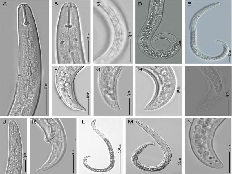 Light microscopy images of Rotylenchulus parvus found in the field site F13-South of Tanganyika Planting Company Limited in Kilimanjaro. A-B: Anterior regions of immature females, C: Lateral field showing four distinct incisures, D-E: Female body showing vulval position, F-I: Female tail region showing tail hyaline part, J-K: Anterior and posterior regions of male, respectively, L-M: Whole body of male and juvenile, respectively, N: Tail of juvenile with a rounded tail tip.