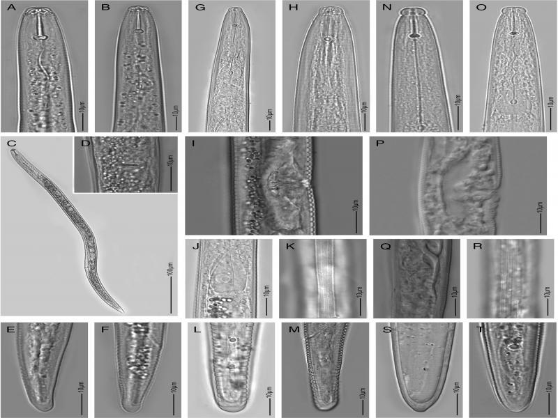 Light microscopy images of three plant parasitic nematode species detected in this study. A-F: Pratylenchus zeae, G-M: Tylenchorhynchus crassicaudatus, and N-T: Tylenchorhynchus ventrosignatus.