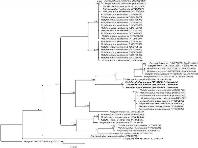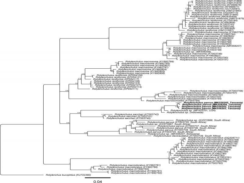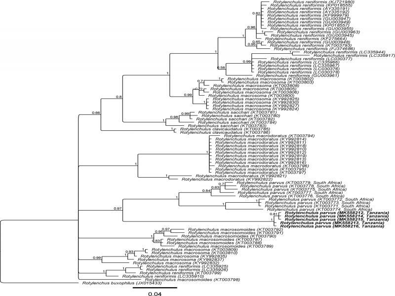 Five ITS sequences (MK558212 to MK558216) with intraspecific variation of up to 0.3% (1-2 bp) were generated for the Tanzanian R. parvus, and the resulting alignment, which included 79 other ITS sequences from seven Rotylenchulus species and South African R. parvus, was 361 bp long. The phylogenetic tree (Fig. 4) inferred revealed a sister relationship of the R. parvus from Tanzania and South Africa (PP = 0.97). However, remarkably, the Tanzanian R. parvus sequences were 65 to 77 bp (18-21%) different from that of the South African R. parvus (KT003771 to KT003779). The phylogenetic position of R. parvus in respect to other Rotylenchulus species remains unresolved in the ITS tree.