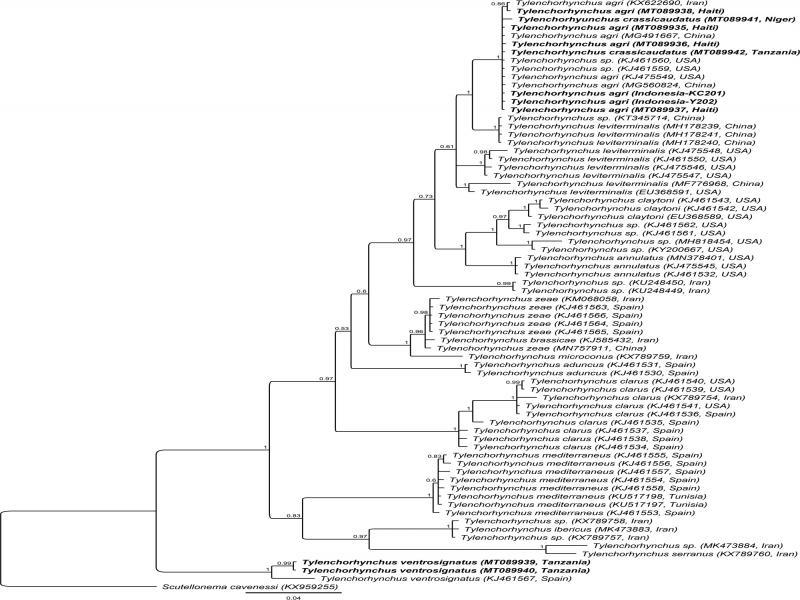 Phylogenetic relationships of Tylenchorhynchus crassicaudatus and Tylenchorhynchus ventrosignatus from Tanzania with other Tylenchorhynchus species. Bayesian 50% majority rule consensus tree was inferred from the analysis of D2-D3 of 28S rDNA sequences under GTR + G model. Posterior probabilities more than 0.5 are given for appropriate clades.
