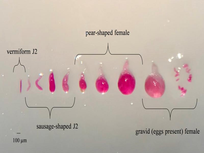 Various life stages of Meloidogyne incognita stained with acid fuchsin. Life stages include vermiform second-stage juvenille (J2), sausage-shaped juvenile, pear-shaped female, and gravid (eggs present) female.