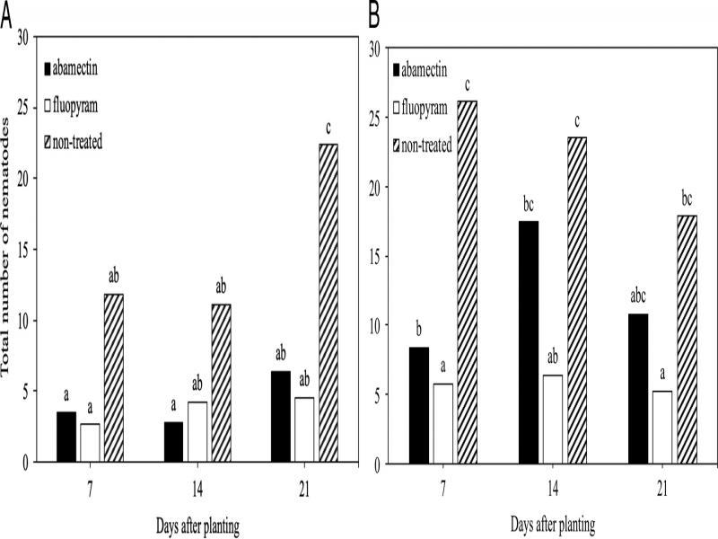 Suppression of Meloidogyne incognita at three sample times by seed-applied nematicides in cotton (A) and soybean (B). Different letters above bars indicate significant differences at α = 0.05 according to Tukey’s HSD test.