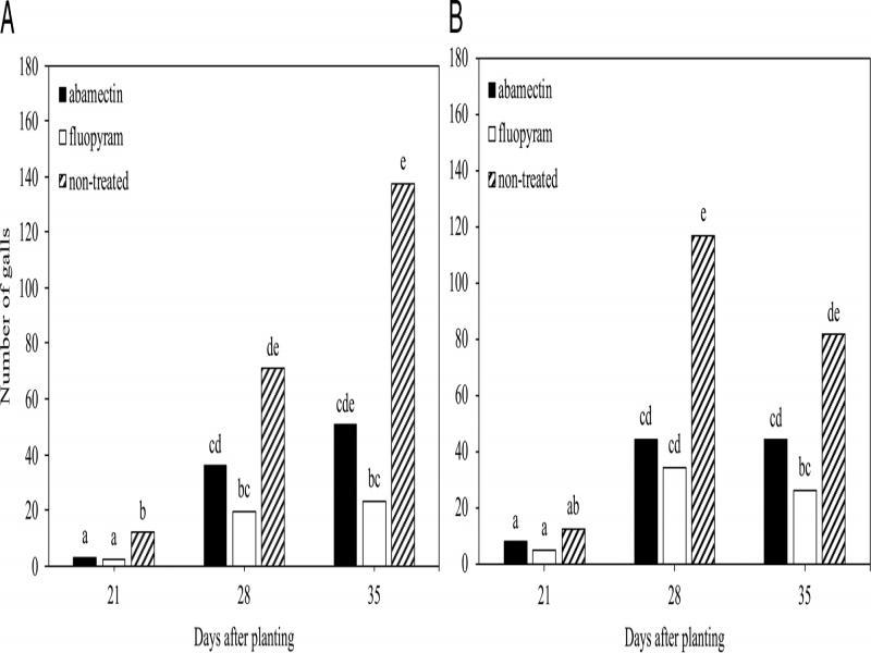 Suppression of Meloidogyne incognita root galling by seed-applied nematicides at three sample times on cotton (A) and soybean (B). Different letters above bars indicate significant differences at α = 0.05 according to Tukey’s HSD test.