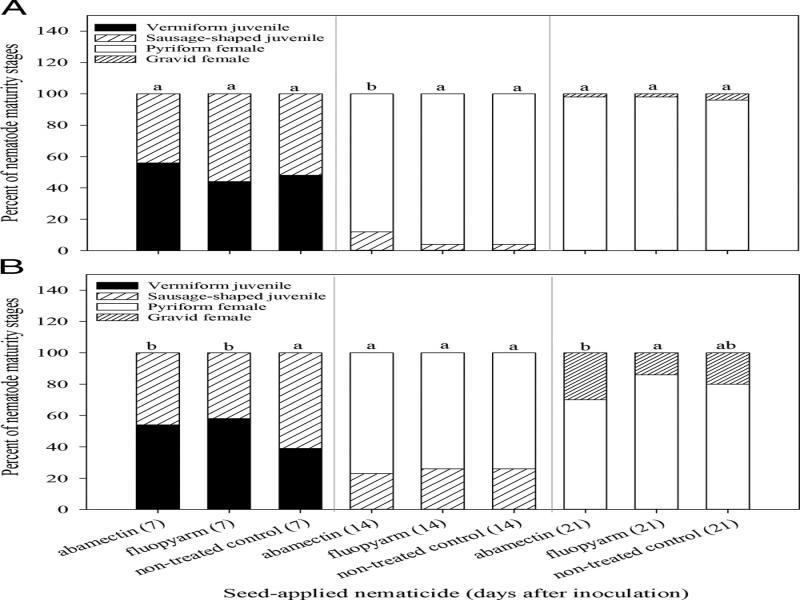 Post-infection maturity of Meloidogyne incognita on cotton (A) and soybean (B) in response to seed-applied nematicides. Different letters above bars indicate significant differences at α = 0.05 according to chi-square analysis applied in pairs of treatments within each sample time.
