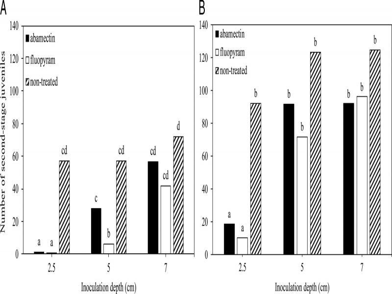 In the depth of root protection experiments, there was no experiment by treatment by inoculation depth interaction for cotton or soybean, however, there was an interaction (P ≤ 0.05) between treatment and inoculation depth for each crop. Fewer (P ≤ 0.05) J2 were observed in roots at 2.5 and 5.0 cm depth for fluopyram and only at 2.5 cm depth for abamectin compared to the non-treated control in cotton (Fig. 6A), whereas a similar number of J2 were observed at 7.0 cm depth for all treatments in cotton. In soybean, fewer (P ≤ 0.05) J2 were observed at 2.5 cm depth for abamectin and fluopyram compared to the non-treated control. Further, a similar number of J2 were observed at 5.0 and 7.0 cm inoculation depths for all treatments (Fig. 6B).