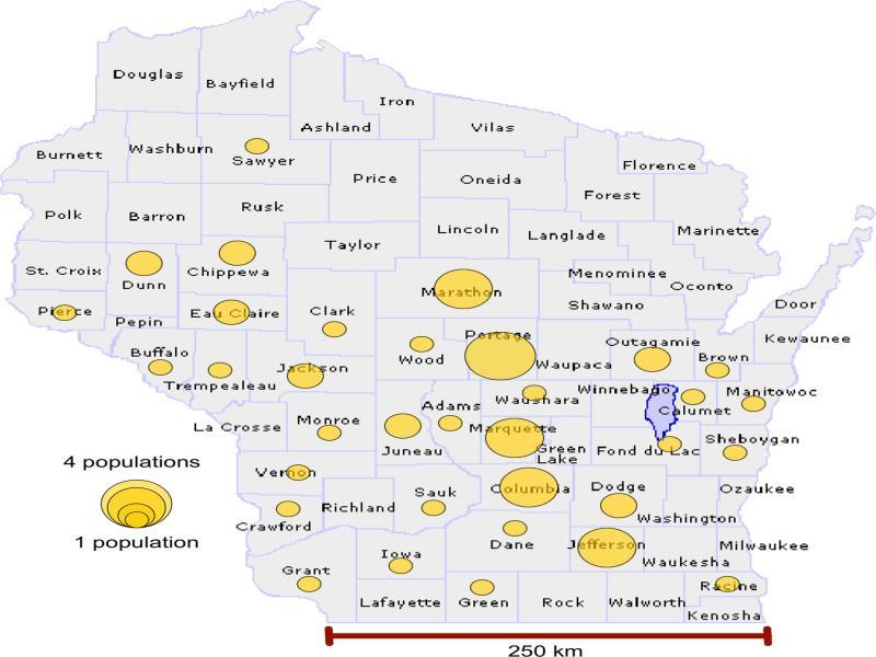 | Population | Portage 1 | Portage 2 | Marathon 1 | Marathon 2 | Chippewa 1 | Chippewa 2 | Calumet | Sheboygan | Wood | Marquette | Buffalo | Grant | Iowa |