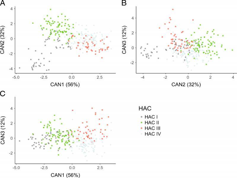 Scatter plot of the clusters of Wisconsin isolates chosen by Hierarchical Agglomerative Clustering (HAC) of morphological characters displayed using canonical variates 1 and 2 (A), canonical variates 2 and 3 (B), and canonical variates 1 and 3 (C).