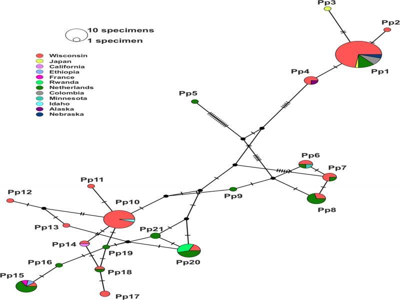 A total of 120 sequences, 72 from Wisconsin, revealed 21 haplotypes for P. penetrans based on COI (Fig. 4). The Wisconsin populations were assigned to 15 of the 21 haplotypes: three shared with other populations from the USA, seven shared with populations from other countries, and five that were unique to Wisconsin. The most common haplotype in Wisconsin was Pp1, which included 32 Wisconsin populations as well as populations from Nebraska, USA, Colombia, The Netherlands, and Japan (Fig. 4). The second most frequent haplotype in Wisconsin, Pp10, included 19 Wisconsin populations and one population from Idaho, USA. In 17 cases, multiple specimens from the same population were assigned to different haplotype groups (Table 3). No relationship was observed between haplotype and HAC assignment for the 13 Wisconsin isolates.