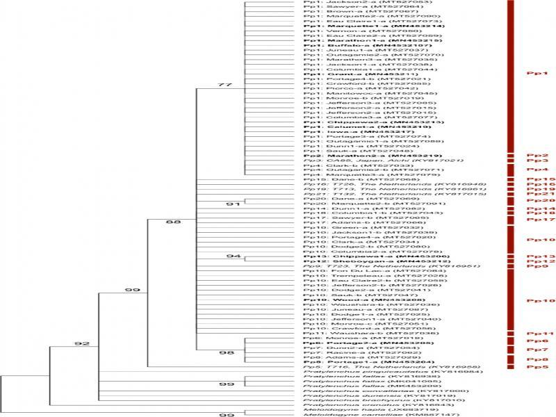 The ML tree based on COI validated that the 72 Wisconsin populations were conspecific with P. penetrans (Fig. 5). The bootstrap value supported the assignment of P. penetrans populations to a clade distinguished from the other species in the Penetrans group and P. crenatus. Within the P. penetrans clade, T716, the Dutch population from Janssen et al. (2017), was assigned to a sub-clade that was distant from all others, but it should be noted that species confirmation by 28S rDNA or other genes is not available for that population. Haplotypes Pp1 to Pp4 were distinguished from others and grouped together in one clade, as were Pp6 to Pp8. The evolutionary relationship of other haplotypes was not clearly resolved in the analysis.