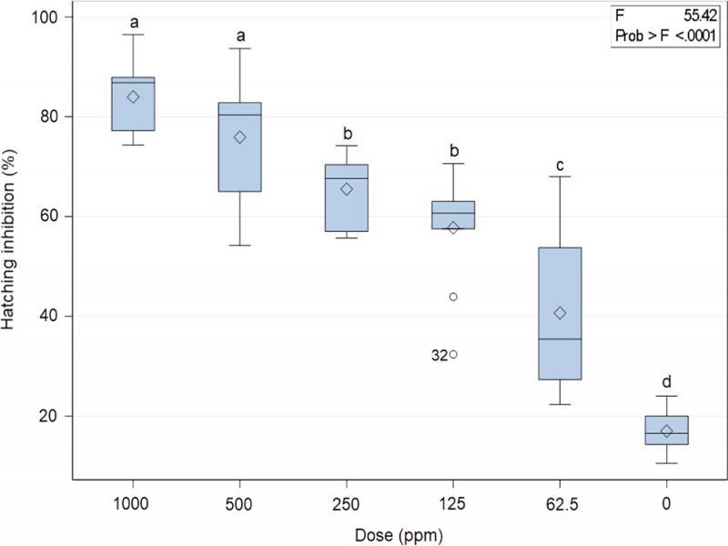 Effect of eugenol on the differentiation of Meloidogyne javanica eggs, after immersion of undifferentiated eggs at different doses of 1,000, 500, 250, 125, 62_5, and 0 ppm_